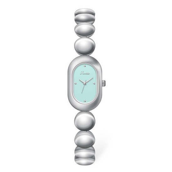 Denna eleganta kvartsklocka har en elegant oval blå urtavla parat med en silverpärlad armband, som erbjuder en förfinad balans mellan charm och modern elegans. Med exakt kvartsurverk och en elegant design, är det den perfekta accessoaren för vardaglig sofistikering.