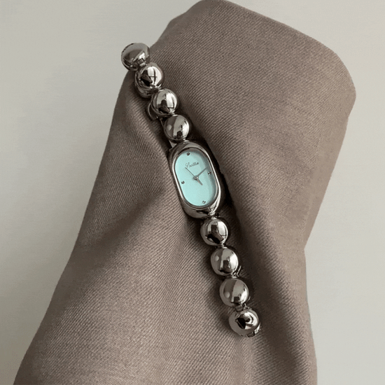 Silverpärlebandskvartsur för kvinnor - Oval Blue Dial, Elegant & Chic
