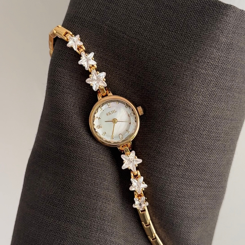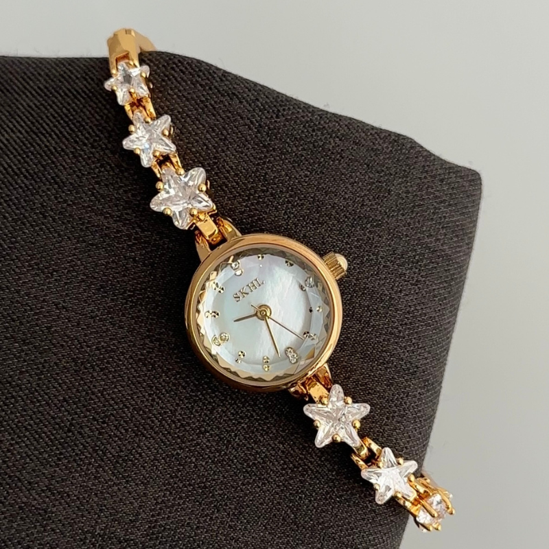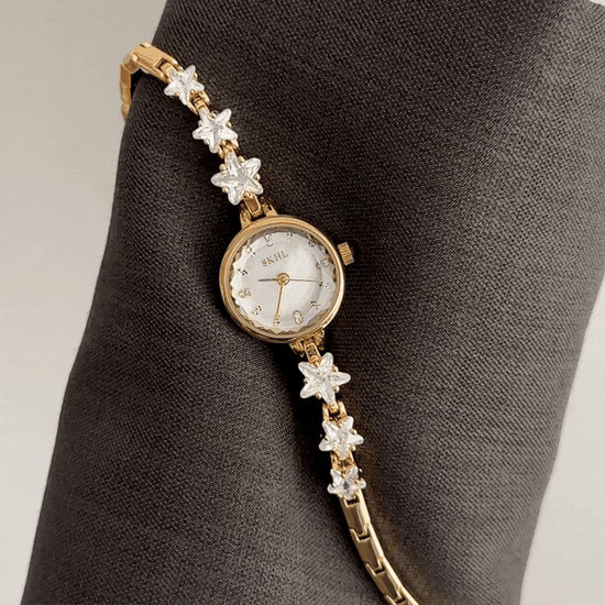 Designed with celestial magic, this watch features a white dial, gold stainless steel bezel, and a star-adorned bracelet. Powered by quartz, it is lightweight and water-resistant for daily wear. Easily transitioning from day to evening, it serves as an inspiring gift or a token of everyday sparkle.