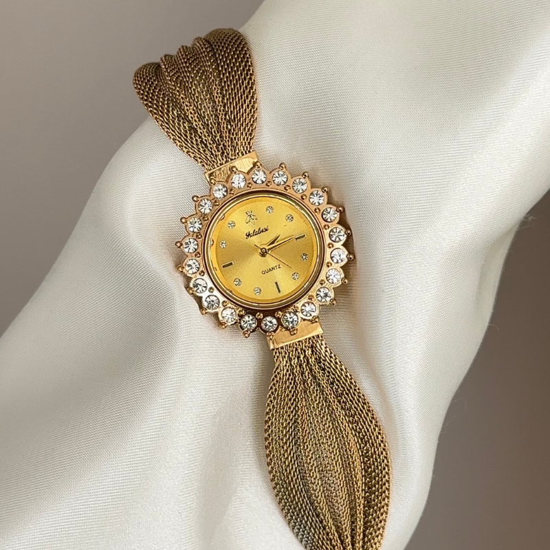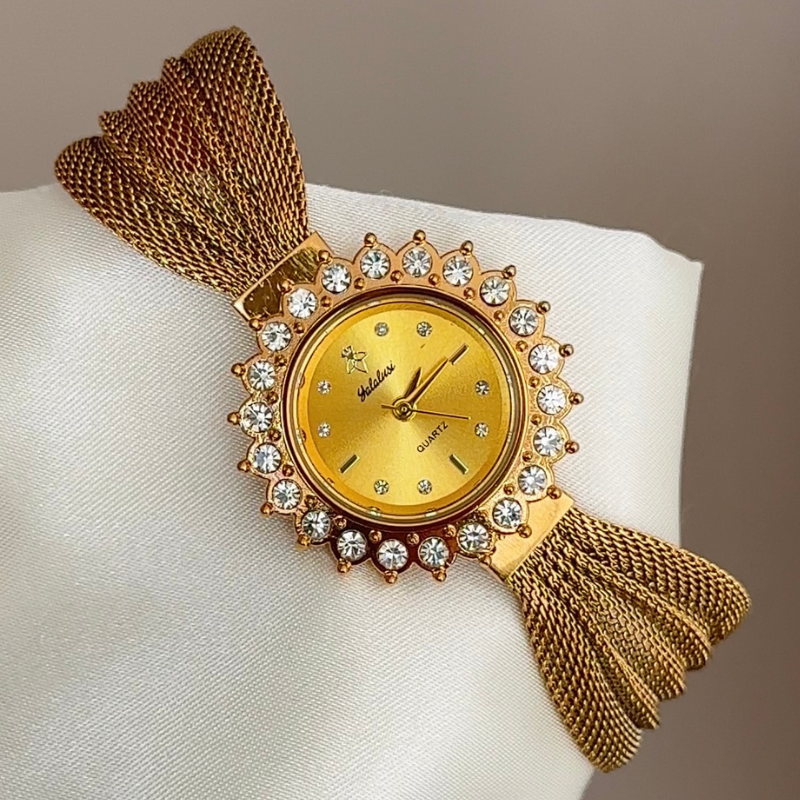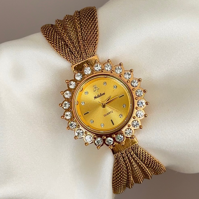 Vintage Radiance: Gold Round Dial & Diamond Sunflower Bezel with Mesh Bracelet, Quartz