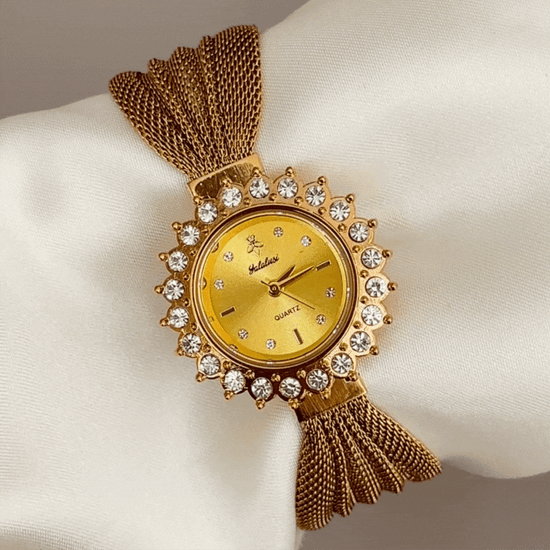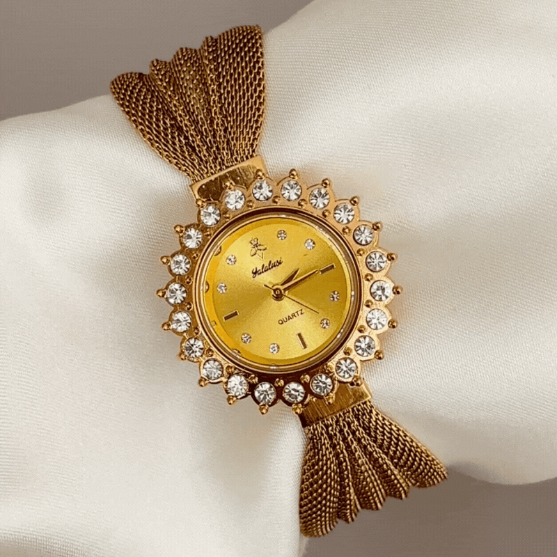 This vintage-inspired watch features a sunburst gold dial framed by a sculpted sunflower bezel set with cubic zirconia. Its lightweight mesh bracelet and reliable quartz movement ensure comfort and precision. Scratch and water-resistant, it’s a timeless accessory perfect for daily wear or as a graceful gift.